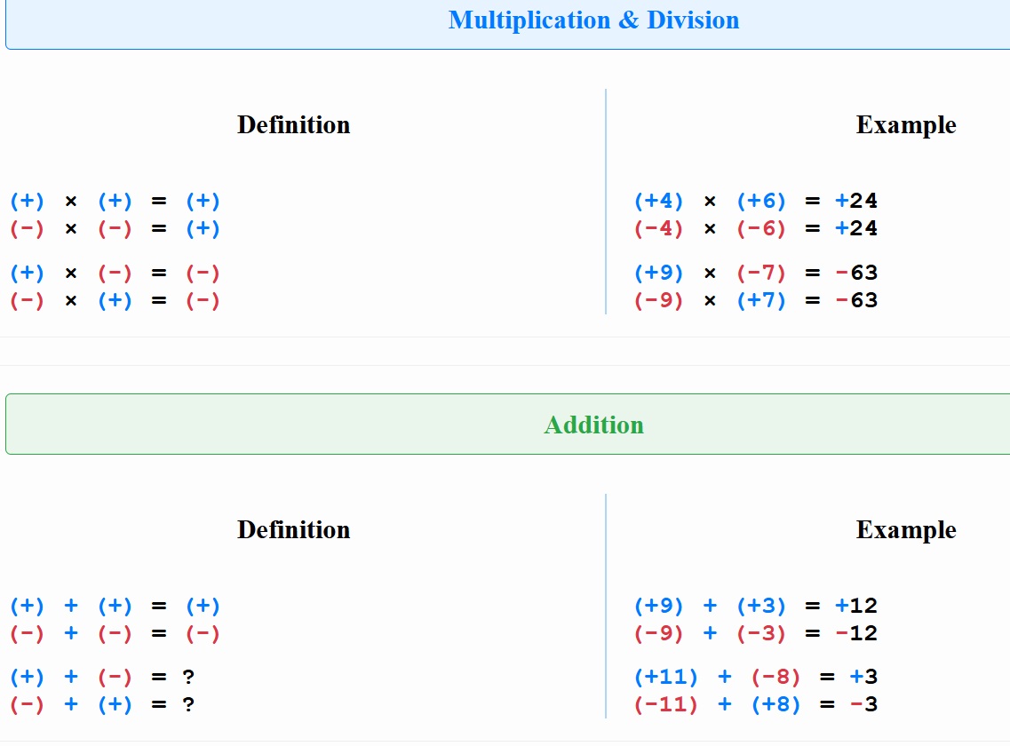 قاعدة الاشارات للضرب والجمع Alg Sign Rule